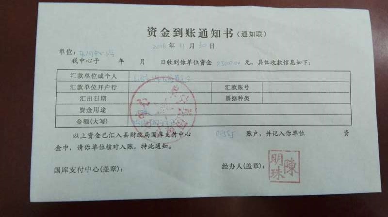 东沟中心小学-资金到账通知书